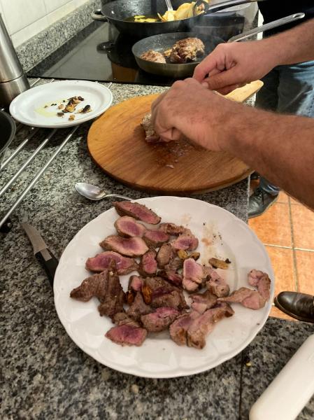 Buenas compañeros, hoy pusimos en la mesa dos lomos de carne de caza, uno de jabalí y otro de cierva. A la sartén con una gotita de aceite de oliva virgen, sal gorda, pimienta negra y un diente de ajo.