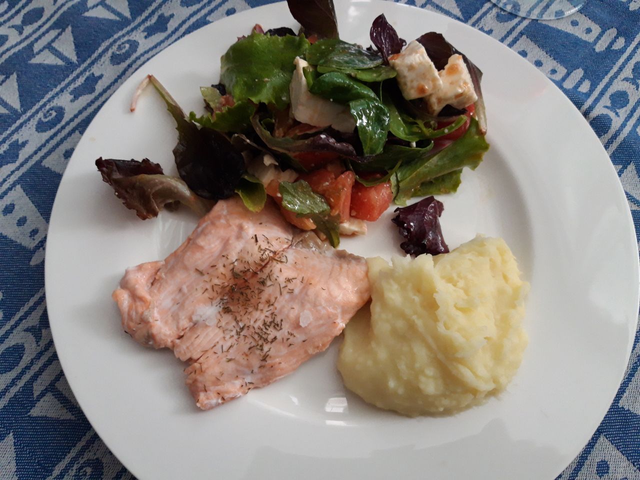 Salmón al vapor con puré de patatas casero (Hausgemachtes Kartoffelpüree), y ensalada de brotes con queso Feta.