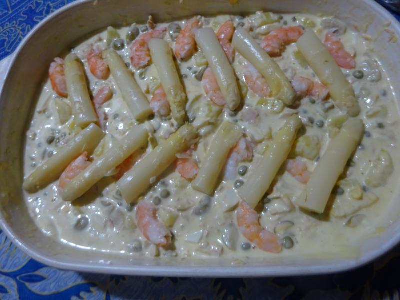 Comida de Semana Santa : Cazuela de dorada, gambas frescas, guisantes y gulas.