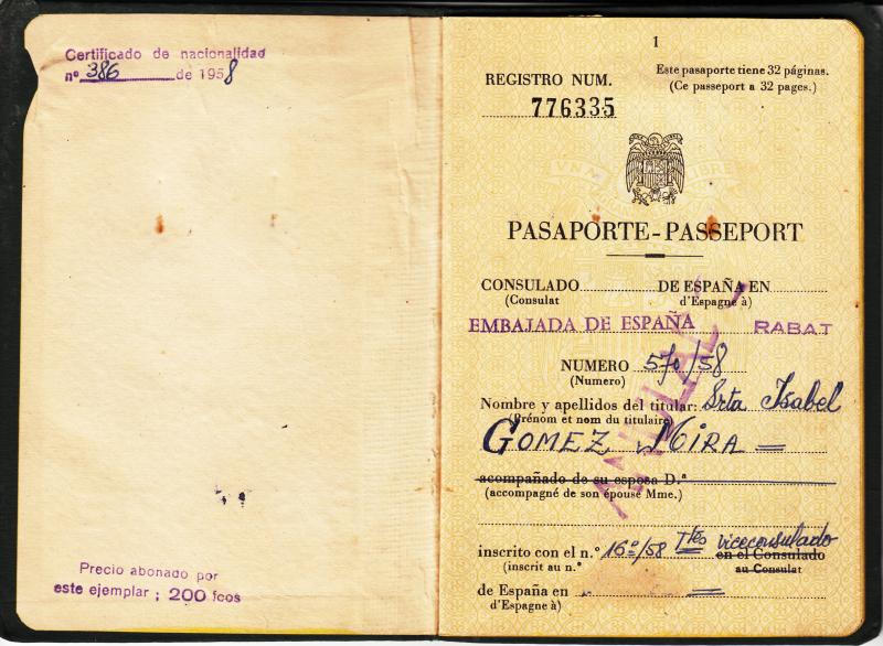 Pasaporte expedido en Rabat ( Marruecos ) en 1958 a la Artista de Variedades Isabel Gómez Mira.