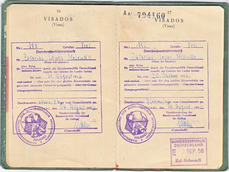 Pasaporte expedido en Madrid en Junio de 1956 al estudiante, Zacarías López Melendo .