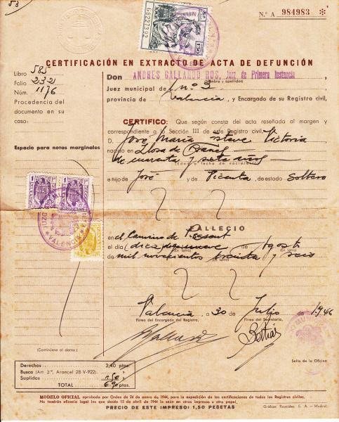 ACTA DE DEFUNCION DE 1946. Diez años despues de su muerte.