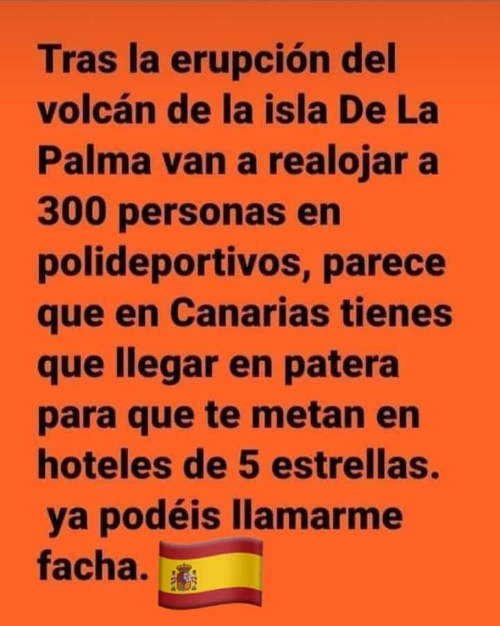 Los politicos van a ir ayi mas a ver el espectaculo de un volcan y hacerse la foto que otra cosa, si al final la ministra Maroto dijo la verdad aunque les duela a muchos... Es un " atractivo turístico" y el turismo de frikis volcaneros no van a tardar en pisar la isla hacerse selfis y comer barbacoas hechas en la lava... Y todo es dinero hasta que el volcan se vuelva a ir a la piltra pueden ser meses de espectaculo y sacar dinero... :cow: