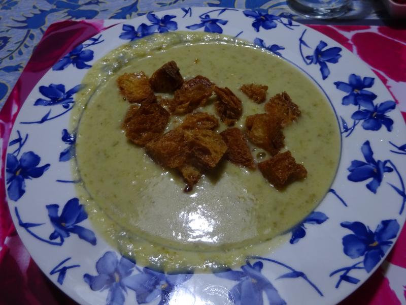 Para cenar puré vegetal de judias verdes, patata y garbanzos con costrones de pan frito.