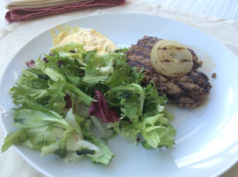 Después del vermú (entre otras, con tapita de patatas costilla adobada), una simple hamburguesa pero con carne procedente de vaca de raza Avileña Negra Ibérica que es lo que le da la gracia.
