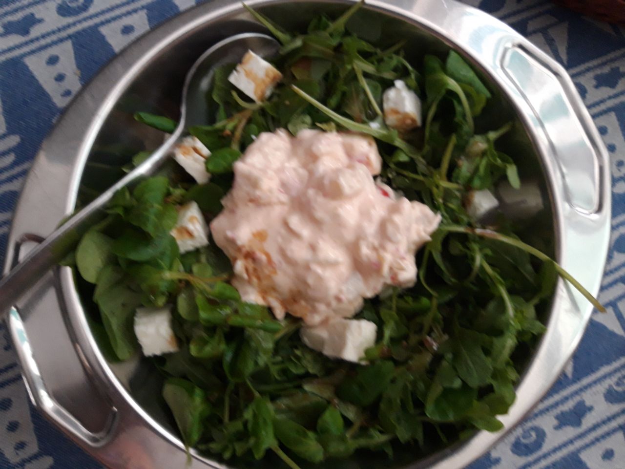 Ensalada de canónigos y rúcula, con cangrejo.