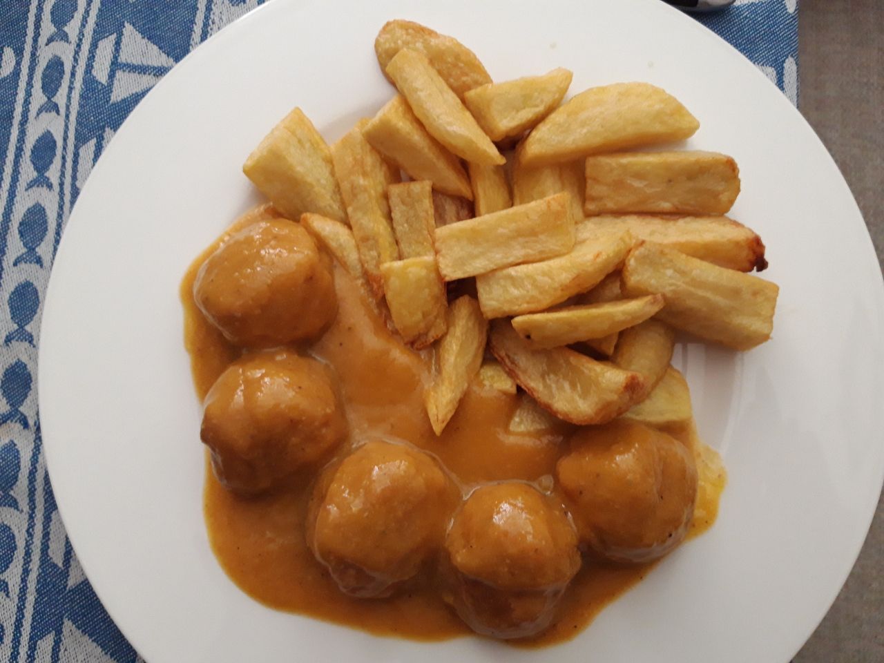 Uboat escribió:Albóndigas de vacuno y cerdo, en salsa de almendras (almendras, zanahorias, cebolla, chorreón de vino blanco, diente de ajo y hebra de azafrán y algo de caldo), con patatas fritas, variedad Agria.