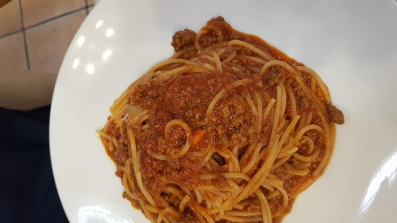 Macarrones finos con tomate casero y chorizo de corzo nevados con autentico Parmesano recien rallado y levemente gratinados