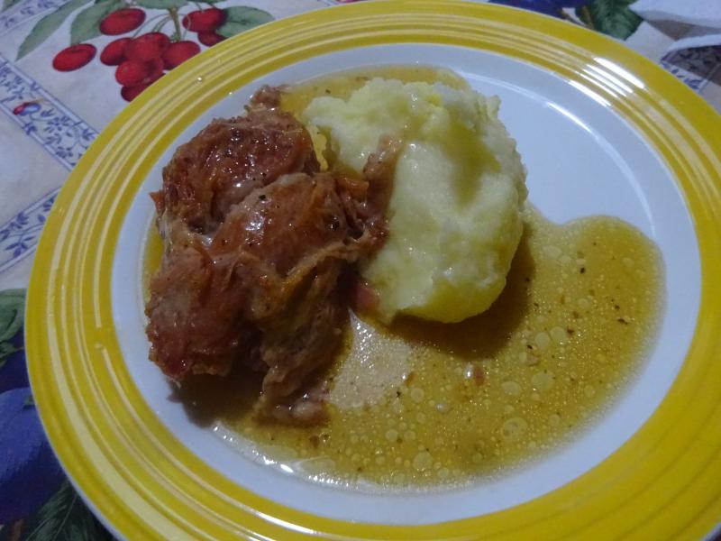Codillo al estilo de Wiesbaden con cerveza Alt, puré de patata y unas pellas de mostaza con Chutney de mango.