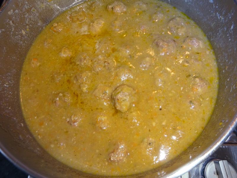 Una vez fritas todas las bolas las napamos con la salsa española, toque de pimienta negra, blanca y nuez moscada, se puede poner un ondaquino de brandy quemado que no estorba y se dejan a fuego muy lento una hora o así y ya quedan listas para ser engullidas, veremos que nos queda en la bodega pero a esta receta le va de perlas un potente tinto ya sea de Ribera o Somontano.