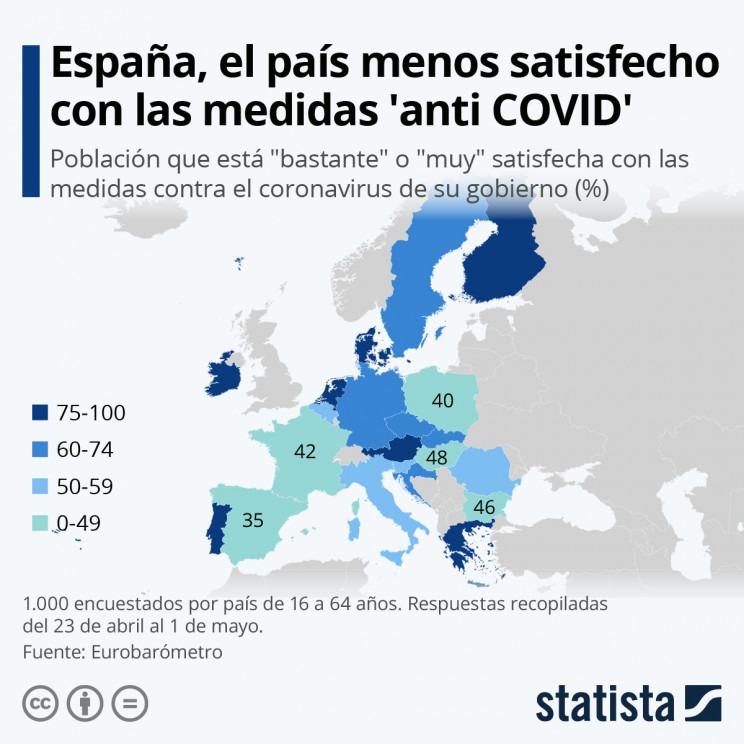 El Parlamento Europeo ha publicado una encuesta sobre la crisis de coronavirus y el grado de satisfacción de los ciudadanos con las medidas adoptadas por los gobiernos para luchar contra la pandemia. España es el país más insatisfecho con las acciones realizadas con un 35% frente al 56% de la media europea.