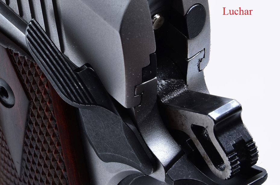 Además, para poder abrir fuego la 1911 requiere que se presione el seguro de empuñadura, que se encuentra en el lomo de la empuñadura.