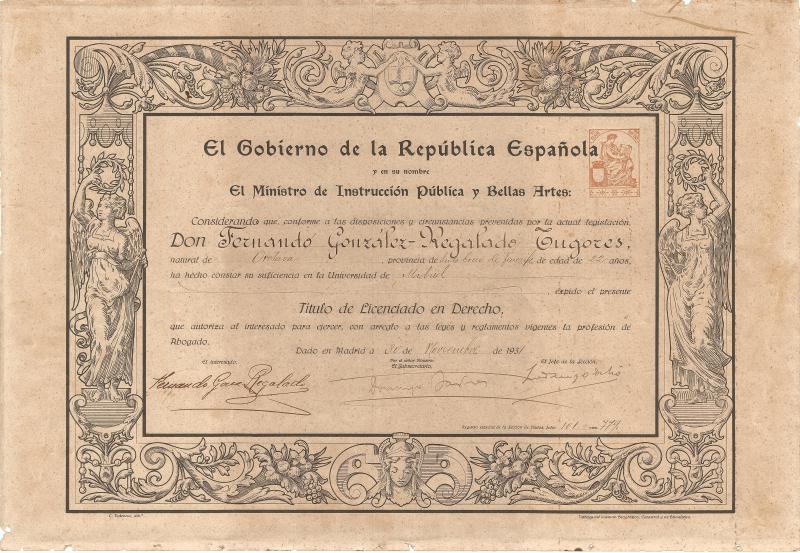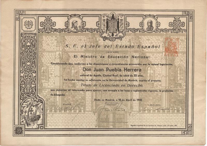 Titulo de Licenciado en Derecho de 1945 de la Universidad de Madrid
