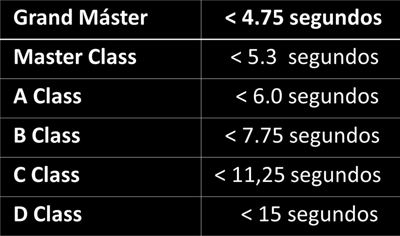 Se miden en 6 categorías (de menor a mayor D, C, B, A, Master Class y Grand Master) usando el tiempo y la precisión como parámetros de medida.