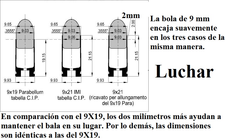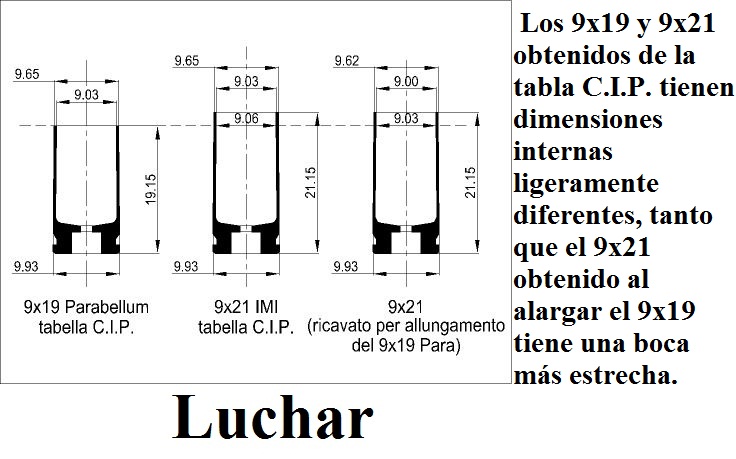 El primero es un Luger 9x19, diseñado de acuerdo con el C.I.P. así como el segundo, que es un IMI 9x21.