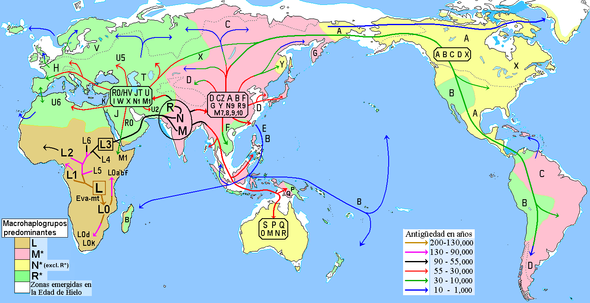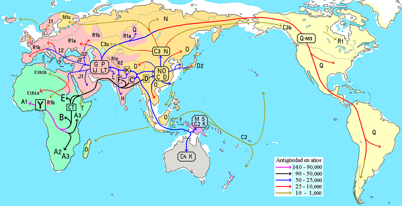 Pongo un par de mapas en los que se muestra la propagación a través del mundo tanto del ADN mitocondrial como del cromosoma Y.