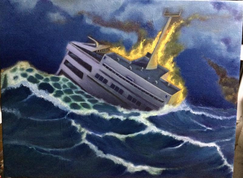 Los cuadros, van por etapas y evolucionan, quedando todavía mucho a este, como eliminar exceso pastoso y demasiado monótono en mar. Es un cuadro 3D, por cierto. Tiene ese efecto. Obdervese cambio en llamas, mas reales, y fondo, y como puente de mando "se proyecta" hacia espectador, emergiendo del agua. Em foto no se aprecia, en vivo si. Hagan click imagen y aumenten zona cabina ( ojo, luz quemada por foco derecho).