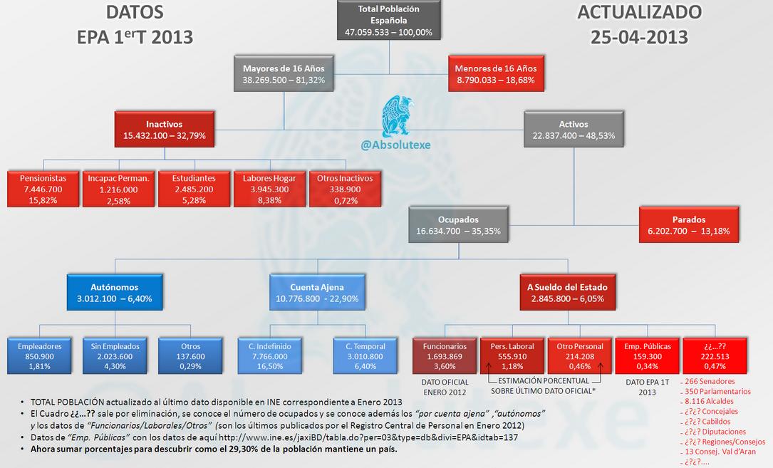 Ahí dice que hay 2.850.800 a sueldo del estado y esto hay que matizarlo, me refiero que no están sumados los trabajadores de las empresas publicas que son una miriada y que en su inmensa mayoría son puestos improductivos y en su totalidad deficitarios.