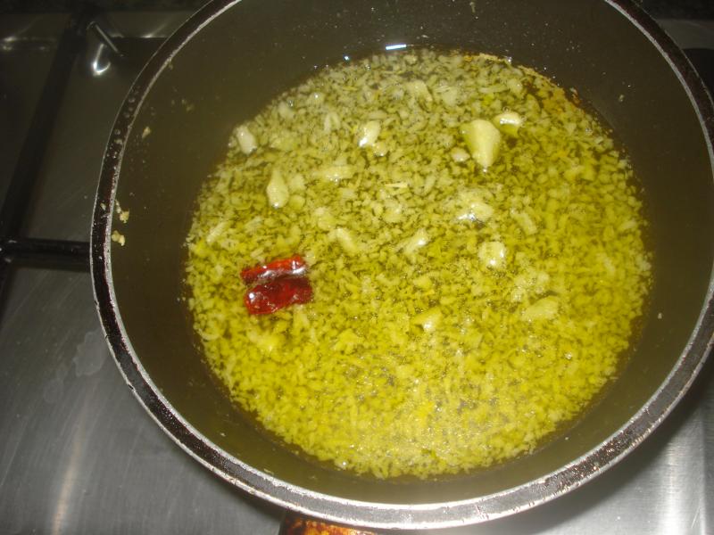 Se pica finamente el ajo y se añade una guindilla, en este caso de unas que pongo en macetas y pican lo suyo.![]()