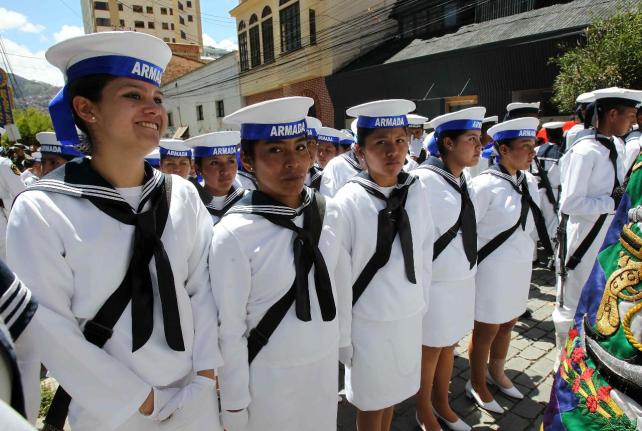 Hola estas marineras pertenecen a la Armada de Bolivia ( que no tiene salida al mar) como se puede observar todas están serias y firme, menos la de la izquierda que esta alegre y con las manos en una zona no reglamentaria.