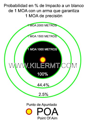 Usaremos como ejemplo un calibre como el 300 Winchester Magnum, en un rifle con una agrupación de un MOA. A 100 metros un buen tirador sera capaz de hacer que los disparos entren en un circulo de 3 centimetros, si el blanco esta a 200 metros, el rifle que mantiene el MOA de precisión hará que el tirador meta los tiros en un circulo de 6 centimetros y así sucesivamente. Cuanto mas se aleje el blanco, aun haciendo un disparo perfecto y manteniendo el MOA de precisión los disparos estarán mas separados unos de otros, no hay que volverse loco y pretender que los disparos se toquen a 1000 metros como a 100. Este rifle con un buen tirador hará que a 1000 metros los tiros entren en un circulo de 30 centimetros, da igual que un tiro este a las 12 y otro a las 6, ambos disparos son prefectos pero nuestro equipamiento no permite hacer que los disparos se cierren más. Esto aumenta según nos alejamos, si nos vamos a los 1500 metros los disparos, haciendo disparos perfectos, entrarían en un circulo de 45 cm.