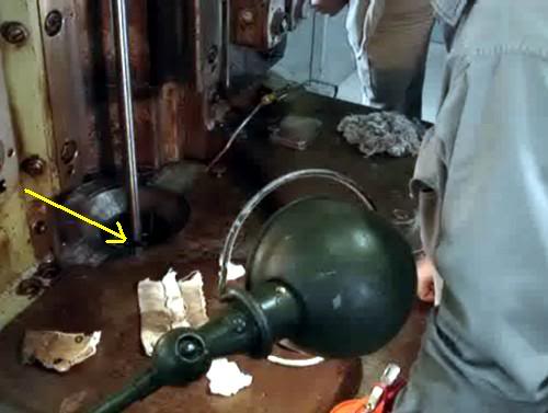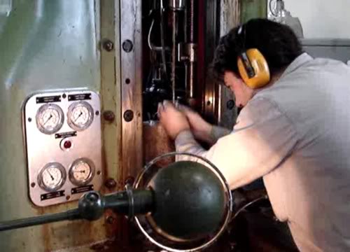 Se aceita el orificio central del tubo, previamente perforado con un diámetro ligeramente superior al peregrino. Notar los mandos de la marteladora del lado derecho y los relojes que miden las presiones de trabajo y dan la información necesaria para el trabajo.