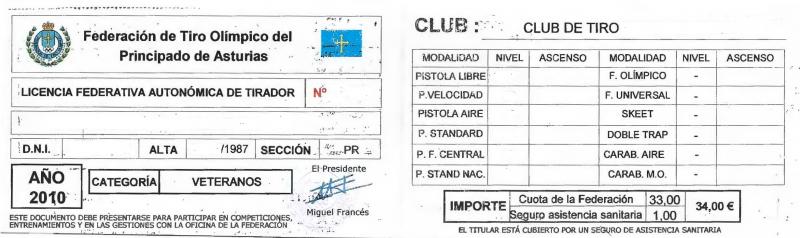 Licencia federativa de 2010. Ultima emitida por la federación Asturiana como entidad autonoma. Podéis ver que la tasa federativa era de 33 €, mas 1 de segro. Total 34 €