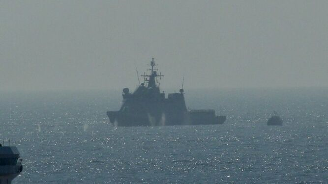 En la foto pequeña patrullera de la armada británica dispara cerca del BAM Audaz en aguas Españolas después de que se le instara a dejar de hacerlo ¿ veis los saltitos en el agua delante del barco Español ? pues son disparos de la marina real. y eso es un día si y otro también.