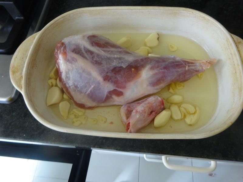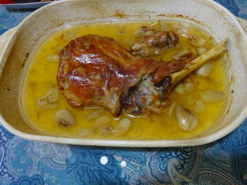 Pernil de lechazo churro asado al horno con ajos confitados.