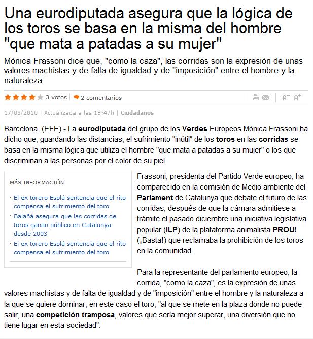 http://www.lavanguardia.es/ciudadanos/noticias/20100317/53897703525/una-eurodiputada-asegura-que-la-logica-de-los-toros-se-basa-en-la-misma-del-hombre-que-mata-a-patada.html