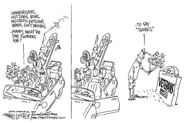 -Cuarta viñeta: "El precio de los perritos calientes" "El precio de la gasolina" "El precio de la libertad" "Cosas que recordar en El Día de la Memoria".