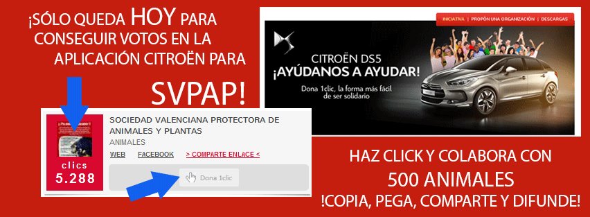 *Si alguien de tu entorno no tiene facebook o no sabe cómo votar, por favor, no dudéis en escribirnos a protectora@svpap.com y os ayudamos a crear la cuenta y votar (podemos incluso crear la cuenta y luego os pasamos las claves, ya con todo hecho; tan sólo tenéis que cambiar las claves posteriormente y usar el perfil sin problemas). Estamos dispuestas a ayudaros con todo lo que necesitéis, pero por favor, necesitamos vuestra ayuda para esos 20 nombres y sus 40 votos.