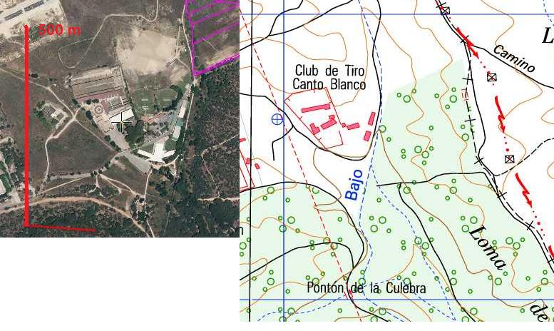 Eso de ahí arriba es una muestra. A la izquierda está la imagen de SigPac, escalada igual que el cacho de mtm25 que hay a su lado. La línea vertical roja mide 500m. Siento la chapuza.