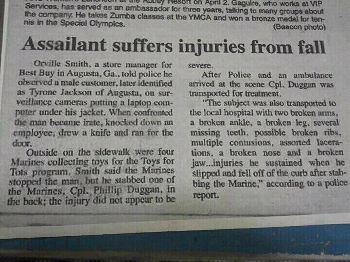 La herida no fue grave, pero después del apuñalar al marine resulta que intentó huir, se resbaló y se cayó al suelo, rompiendose ambos brazos, un tobillo, una pierna, varias costillas, la nariz, la mandíbula, junto a la pérdida de varias piezas dentales y laceraciones varias.