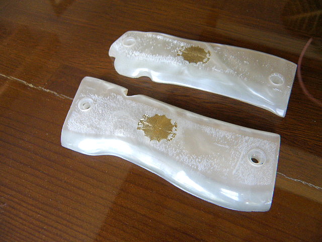 En lo referente a las otras, pues que decir......no hay tu tia........la de un lado, es micarta blanca, y la otra es de imitación nacar..........igual el vendedor tiene la enfermedad ocular esa que no distingue colores y tamaños......y hasta formas.