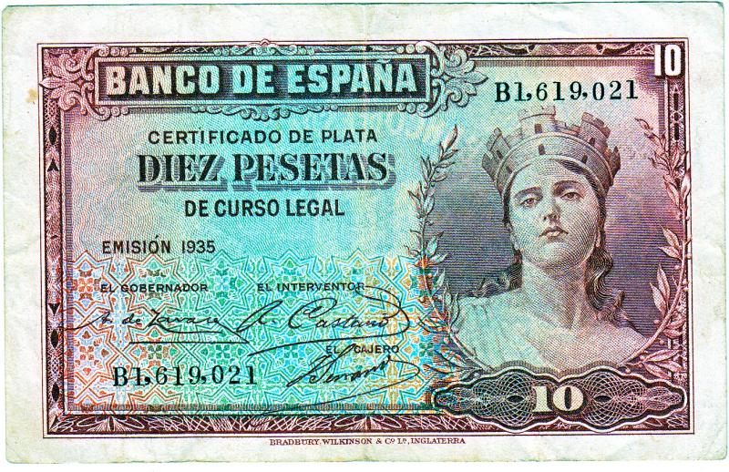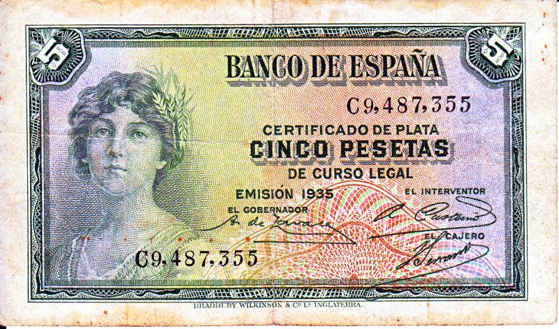 Hola fenris de acuerdo en casi todo, solo que este billete si bien es republicano es anterior a la guerra civil, dichos billetes para garantizar la economía Española antes de la guerra se fabricaron en Inglaterra como podras leer debajo del mismo, cuando empezó la guerra la cosa se convirtió en un cachondeo de papeles sin valor al ponerse a fabricarlo la FNMT en la zona republicana y el gobierno nacional a fabricar los suyos en burgos, los republicanos cada vez valían menos y los de los nacionales mas, aunque solo podían comprar en el extranjero sus armas pagando en oro o en materias primas ambos bandos.
