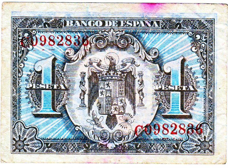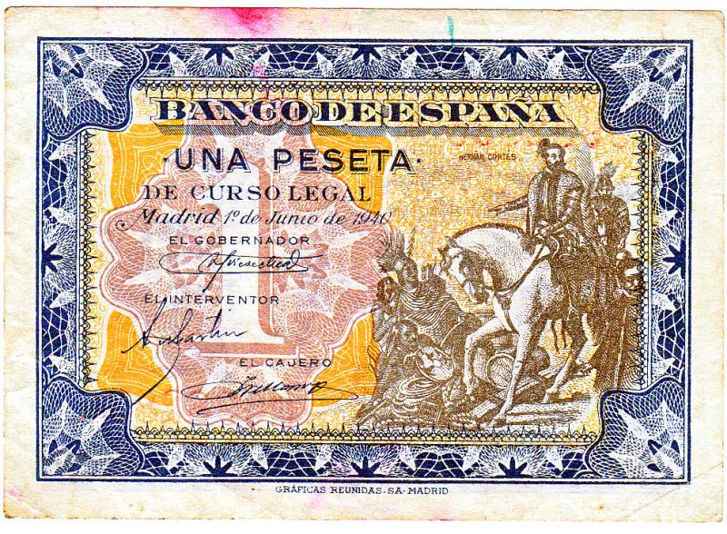 Billete de una peseta fabricado por GRAFICAS REUNIDAS SOCIDAD ANONIMA EN MADRID en 1940 ya en tiempos de Franco.