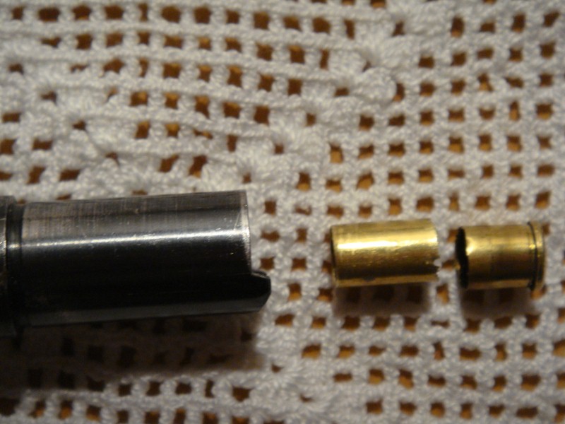 mirar no cansaros de buscar, esta clarisimo el crimpado o la carga son incorrectas y no apoyan la vaina sobre la recamara o si la apoya con una excesiba carga arrastra la vaina hacia el interior de la recamara y como estas vainas son deviles las parte por el centro, hay ocasiones que si el grimpado es mucho llegan a introducirse asta la mitad del cañon, cosa muy peligrosa por que si no te das cuenta en el siguiente disparo te puedes encontrar con un ostaculo dentro del cañon y te puede dar un reventon serio,osea que si pensais recargar este tipo de vaina andaros con cuidado y como mucho yo las recargaria 4 o 5 veces.
