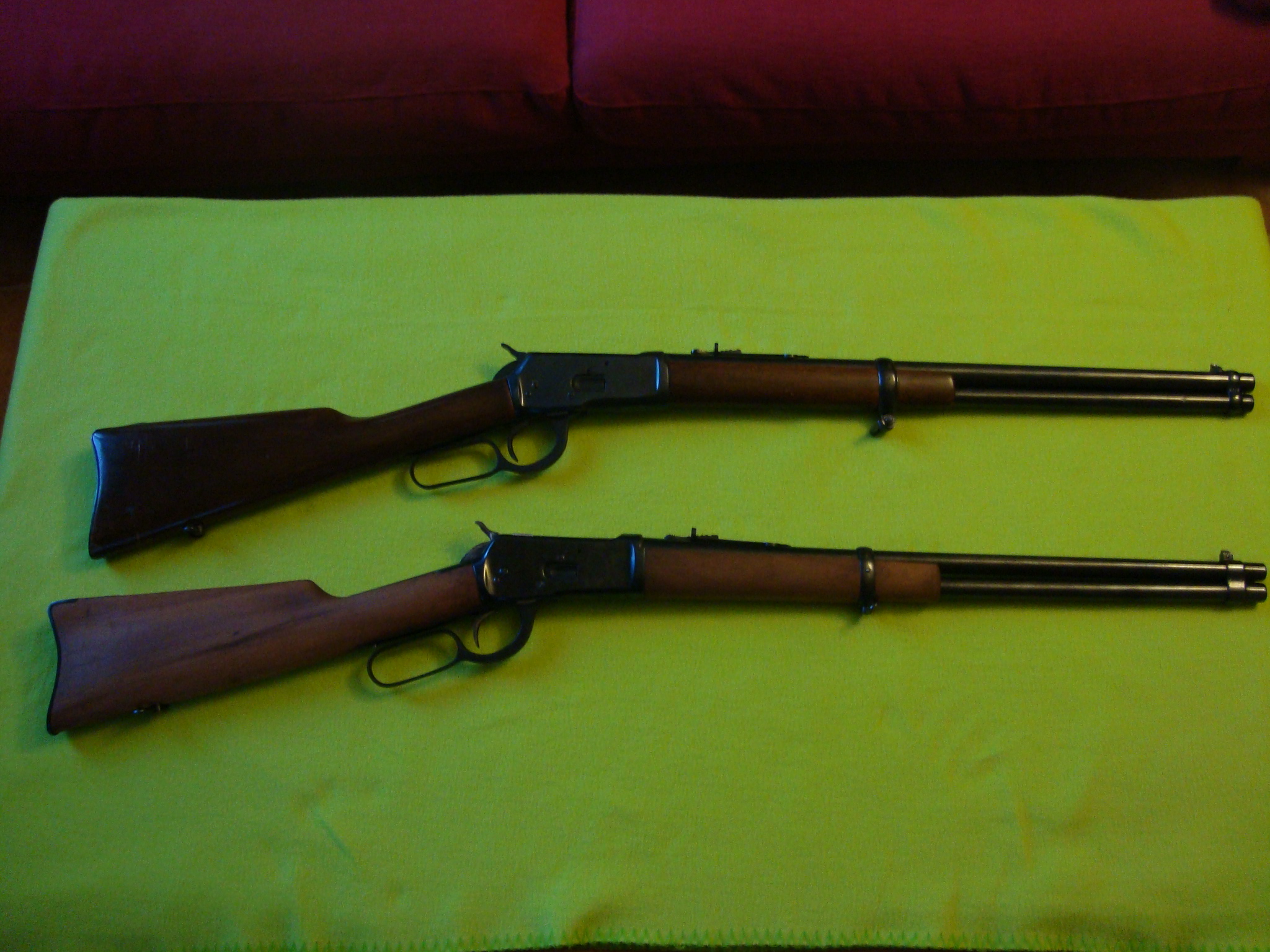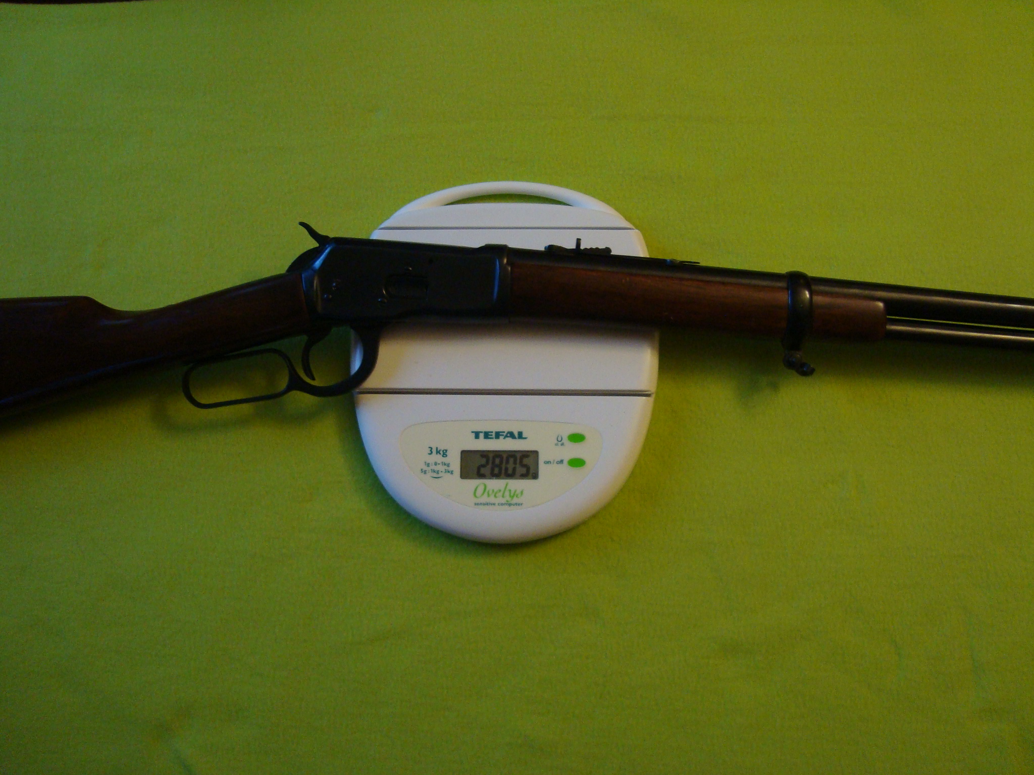 Es mayor el grosor del cañon de la carabina con madera oscura. La diferencia es de 215gr mas en esta que la de color claro (mod. 1919, fijate en el marcador de la bascula. adjunto la fotografia de pesaje que faltaba.