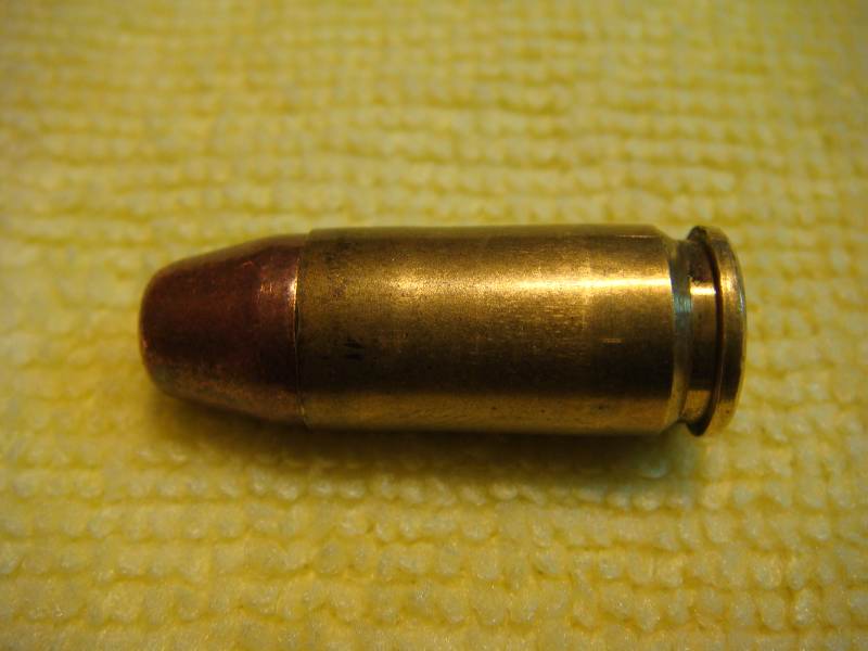 Estoy convencido que conocen que, en este calibre concreto, el elemento mecánico que impide que el cartucho se introduzca en exceso en la recámara es la boca de la vaina ("headspaces on the case mouth"), por lo que la mayoría de los manuales no recomiendan crimpar, o, caso de hacerlo, hacerlo muy ligeramente. En los cartuchos usados para estas pruebas, el diámetro de la boca de la vaina estaba muy cerca (0,375) del valor nominal (0,380). Adjunto imagen de cartucho de prueba terminado.