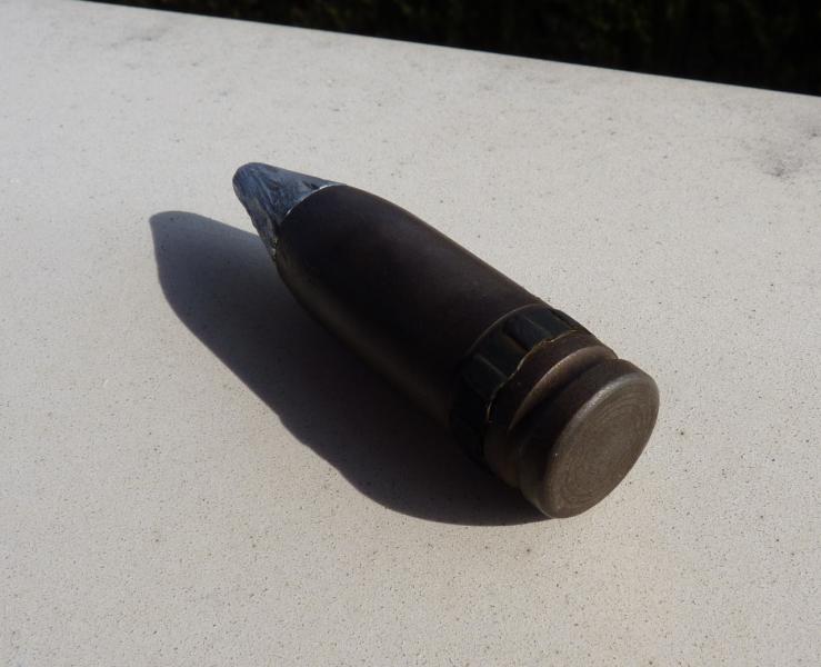 Parece un 20x110 Oerlikon de algun tipo de montaje antiéreo , si es de la GCE podria ser perfectamente alemán. El proyectil parece ser rompedor , osea que debajo de la punta blanda se debe de alojar la espoleta el multiplicador y una carga explosiva.