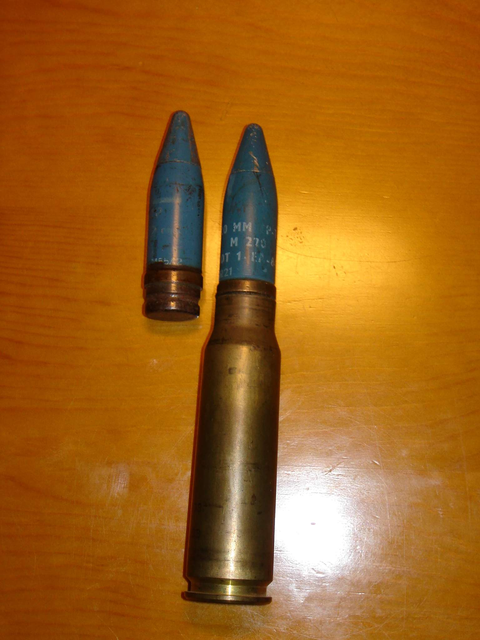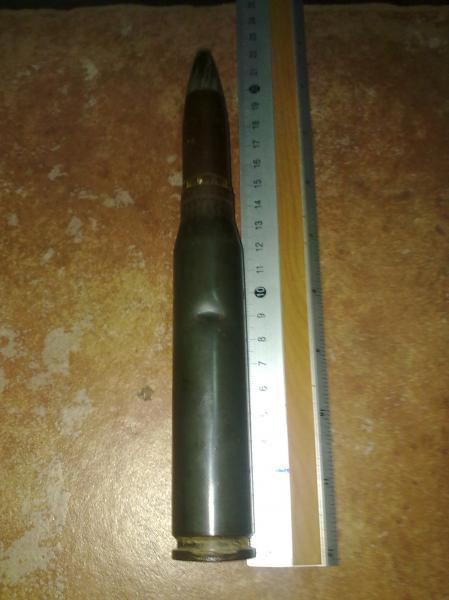 yo colecciono este tipo de municiones y esta de la foto o es un 25mm o un 30mm deffa de aviacion. mide el diametro hacia la mitad del proyecctil. este tipo es de ejercicio y van pintados en azul.