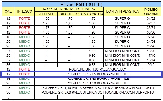 Si te fijas en la tabla de carga es con polvora PSB1 - CSB1 que se comenta que es la equivalente a la actual Optima A.Fijate en la carga para calibre 12 con proyectil, Borra-Proiettile te la he enmarcado en azul OJO REBAJA UN POQUITO LA CARGA Y PRUEBAS