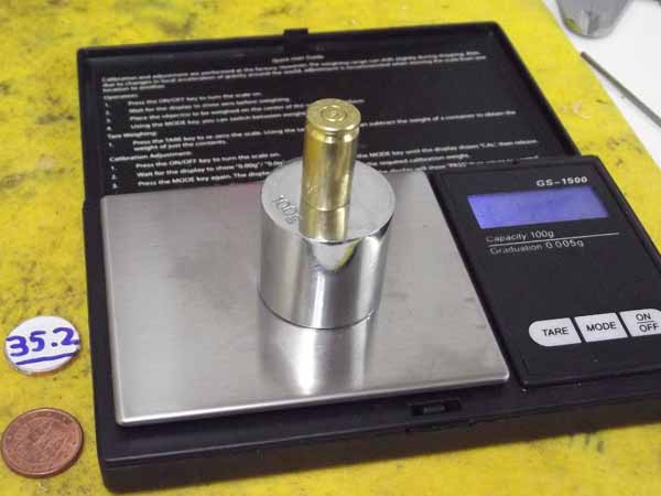 Las monedas que uso de referencia las guardo en una bolsita de plástico y las manejo con pinza. Me doy por contento si pesa 35,5 ó 35,6 grains cada vez. Mi balanza es bastante cutre. Es un asunto pendiente.