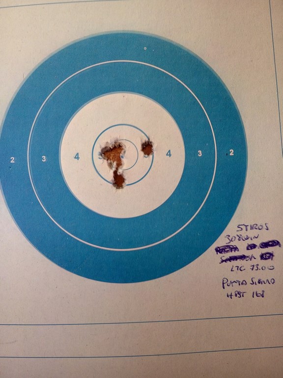 Por cierto ayer probé una de las cargas que realice con el 308 win ya un poco en serio para comprobar agrupación a 100 mts y después de haber estado toda la noche de juerga por la boda de un compañero estos son los resultado con punta Sierra HPBT Mach King de 168 grain con 40 grain de GDB111.