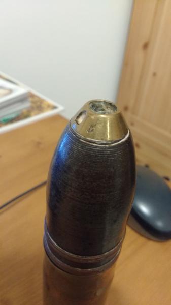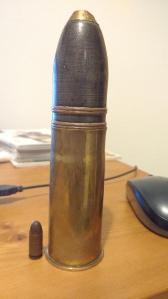Muy buenas, hace unos días adquirí un proyectil de 37mm, hasta donde yo entiendo, es un 37x94mm, usado en ametralladoras tipo Maxim, la qf 1 aa o bien la Maxim Pom Pom, las cuales eran anti carro, anti blindaje. Habían de diferentes puntas también.
