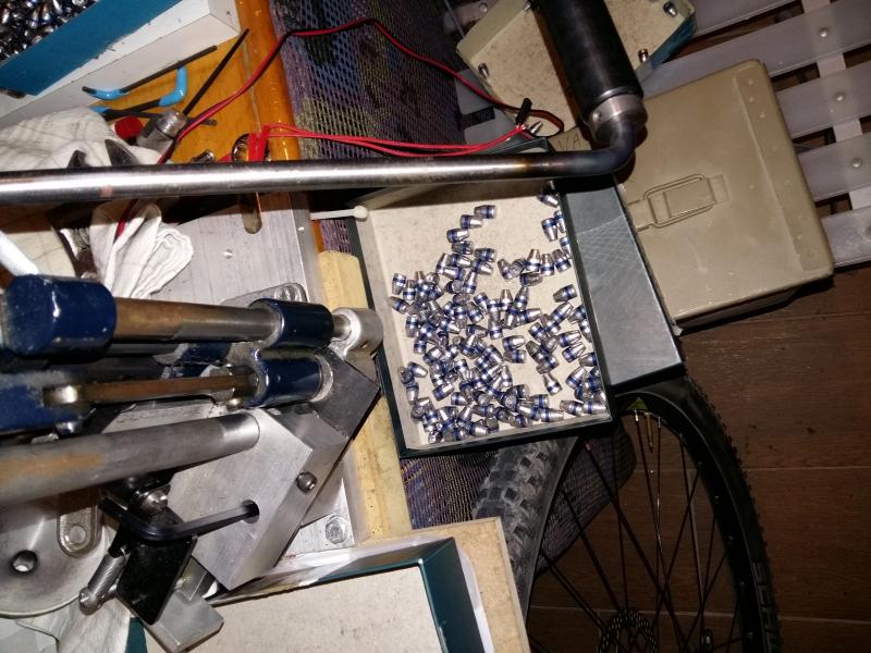 No he hecho mas que ajustar el molde nuevo y en menos de 10 minutos han salido estas ciento y pico puntitas... he pesado TODAS... entre 126.6gr y 127.1 para un molde tarado a 125gr. Aleacion 1/6 de linotipia. Dureza 12 brinels.