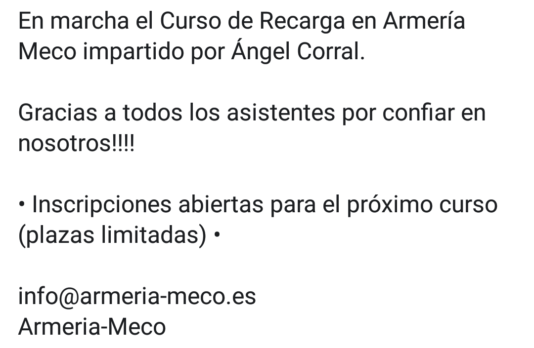 En el club en donde tiro, imparten el 21 de octubre un nuevo curso de recarga. Zona de Lleida/Lérida, Ctra. N-230 km. 11,8. Comida más que digna incluida en el mismo restaurant del complejo, aparte del material necesario, libro, incluso en soporte digital -creo, al menos en el curso que yo asistí lo dieron