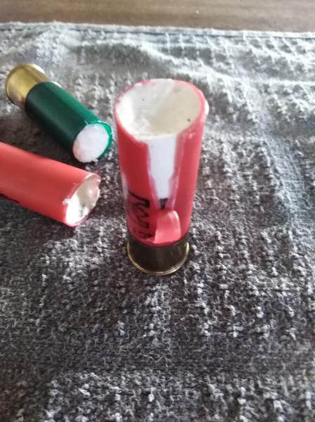 Hola compañeros, resulta que arme unos cartuchos usados de practica para la escopeta, los corte y rellene con silicona y cambie el fulminante por un poco de corcho como se ve en las fotos...
