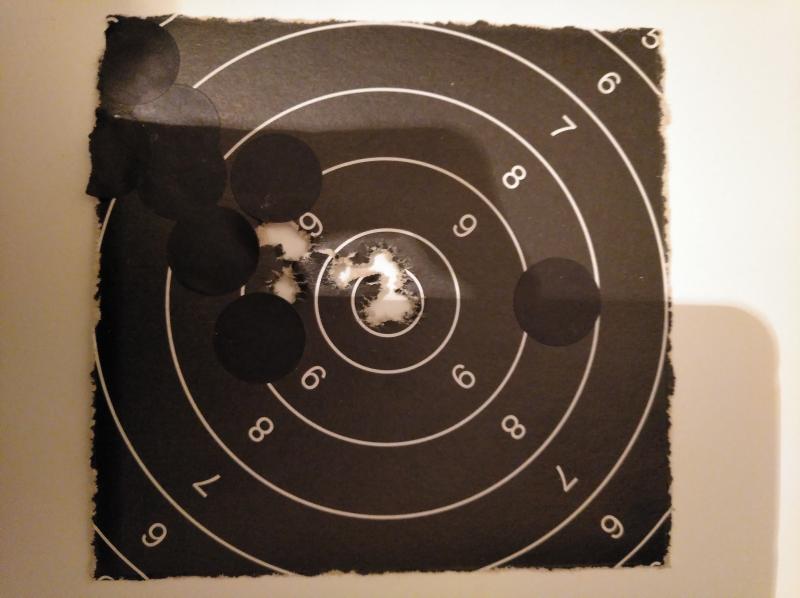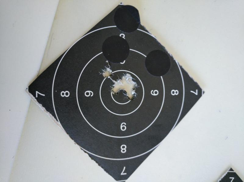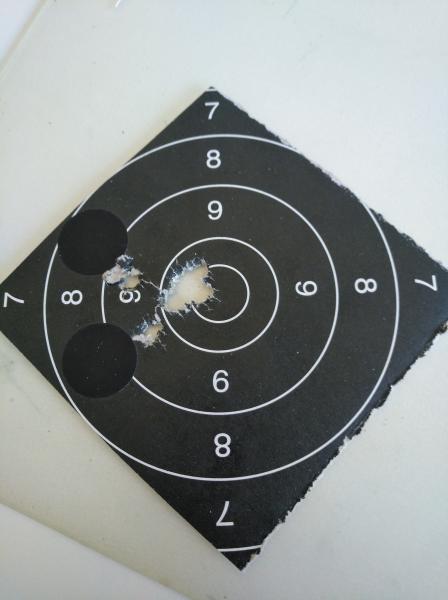 Este blanco es a 100 metros en posicion tendido, sin apoyos. El primer tiro alto por no dejar una pequeña luz entre el punto y la base del negro. Los otros cuatro...que decir, satisfacción pura. Imagino que apoyado, el grupo será bastante mas homogéneo y cerrado